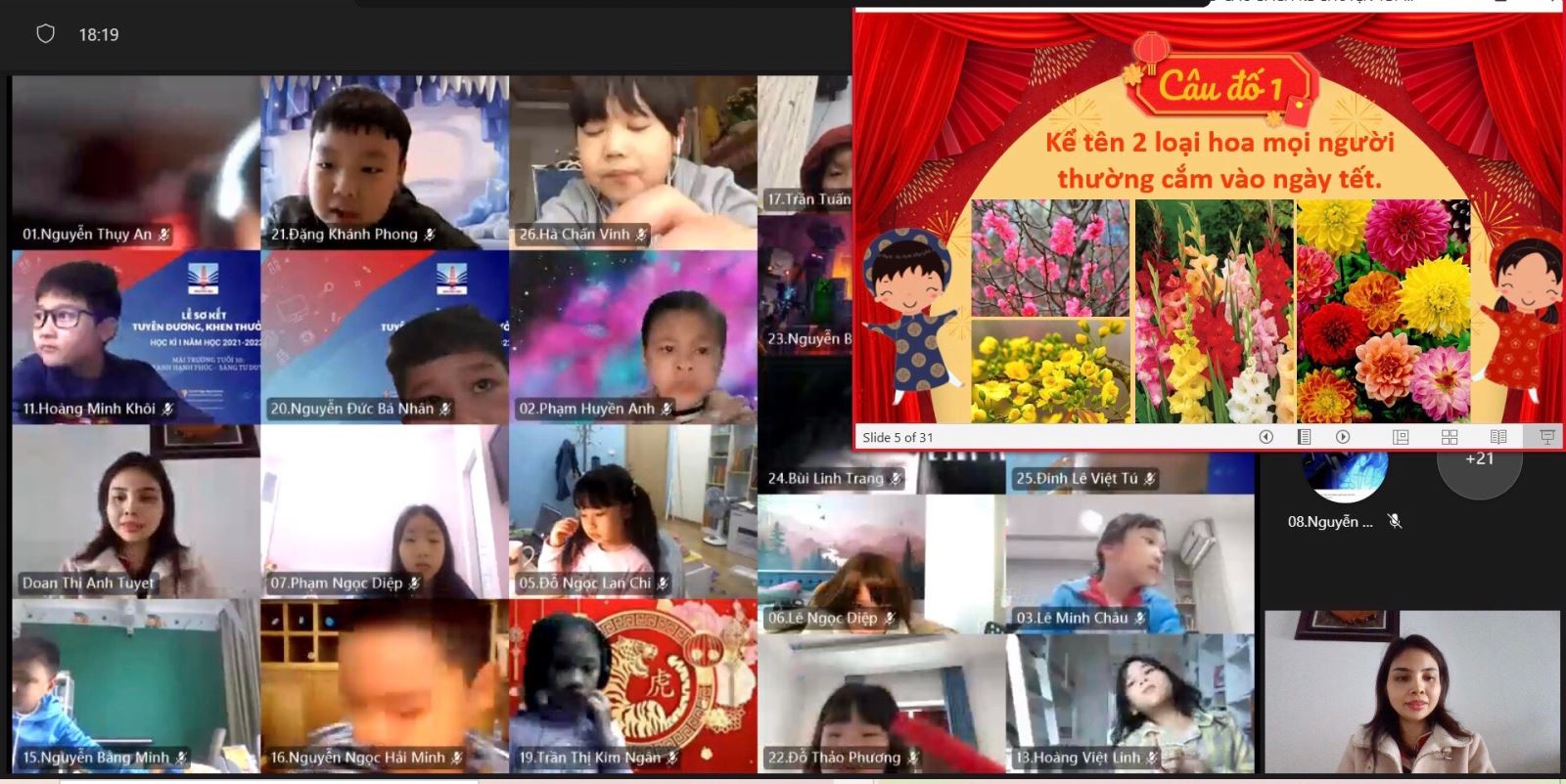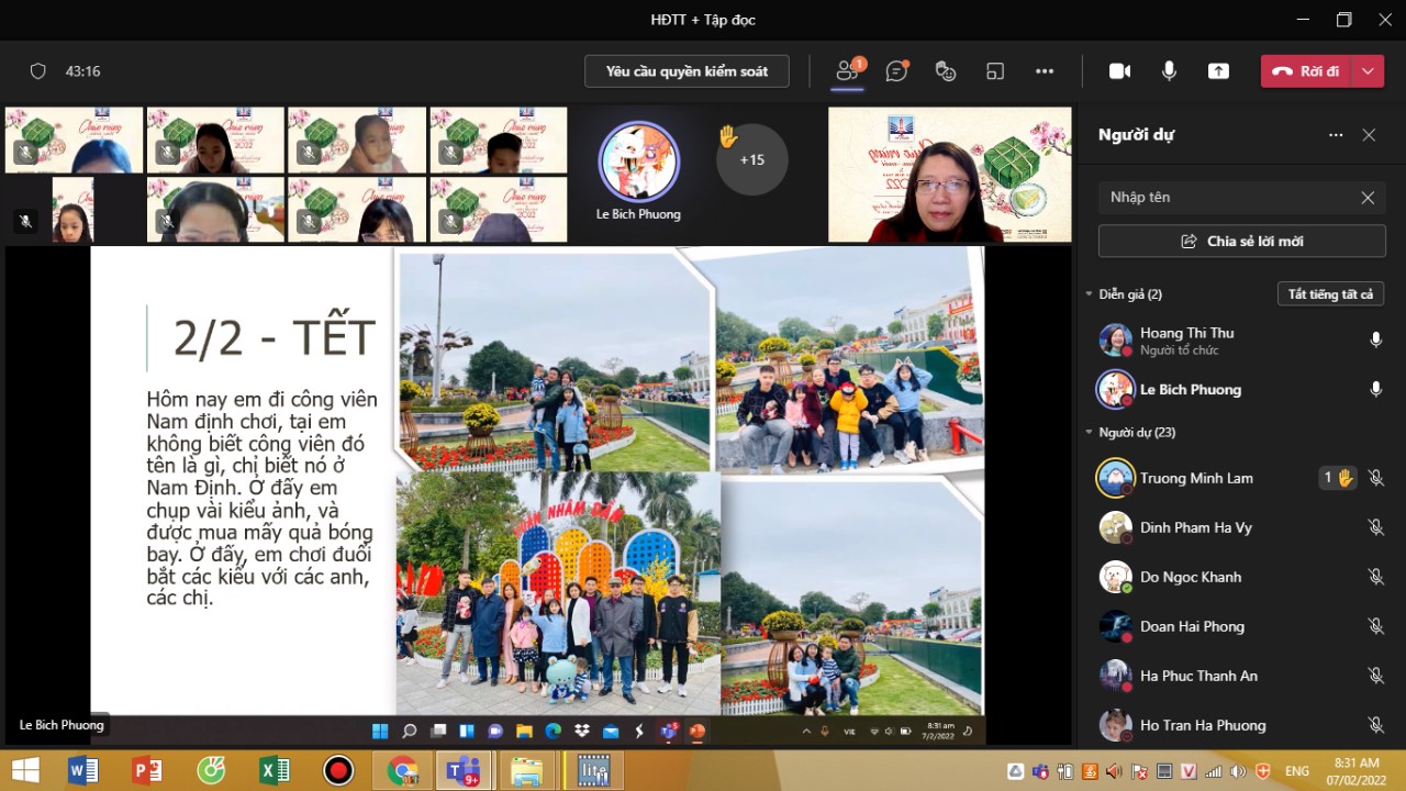 Trong tiết học đầu tiên sau kỳ nghỉ Tết Nguyên đán, các bạn học sinh Tiểu học đã cùng nhau dự lễ chào cờ đầu Xuân, chia sẻ với nhau về các hoạt động trải nghiệm của mình trong dịp Tết cổ truyền (video, hình ảnh trang trí nhà cửa, làm bánh, chúc Tết...), triển khai những hoạt động sắp tới và thưởng thức các tiết mục văn nghệ chào Xuân.
