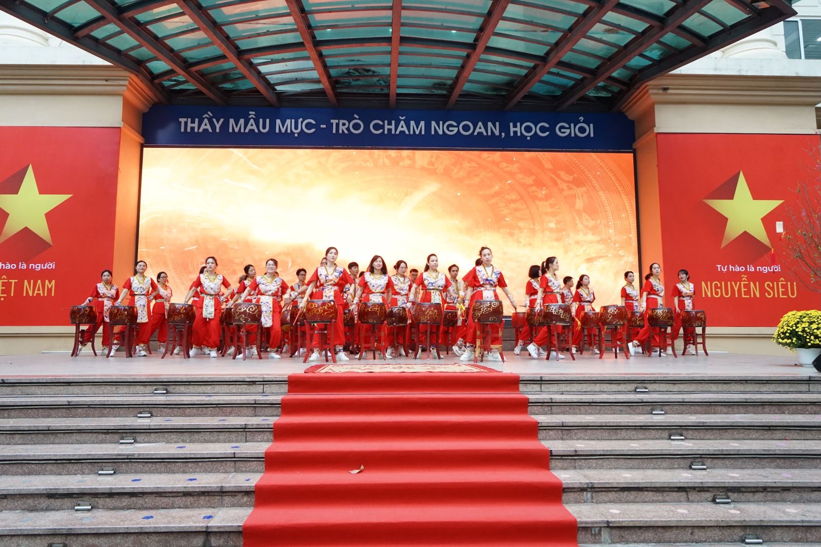 Tiếp nối mạch nguồn văn hoá, không khí Ngày hội trở nên bùng nổ, rộn ràng hơn với màn trống khai hội rộn ràng và khí phách trong giai điệu hào hùng của bản nhạc “Dòng máu Lạc Hồng”. Đặc biệt, tiết mục còn có sự tham dự và kết hợp giữa các thầy cô, các bậc cha mẹ, hòa nhịp cùng các con học sinh Nguyễn Siêu kiêu hãnh giương cao lá cờ biểu trưng cho những giá trị cốt lõi và triết lý HPL (High Performance Learning) mà Nhà trường đang áp dụng. Đó chính là minh chứng cho sự đồng hành, sẻ chia và chung tay xây dựng mái ấm Nguyễn Siêu trong suốt chặng đường 35 năm qua.