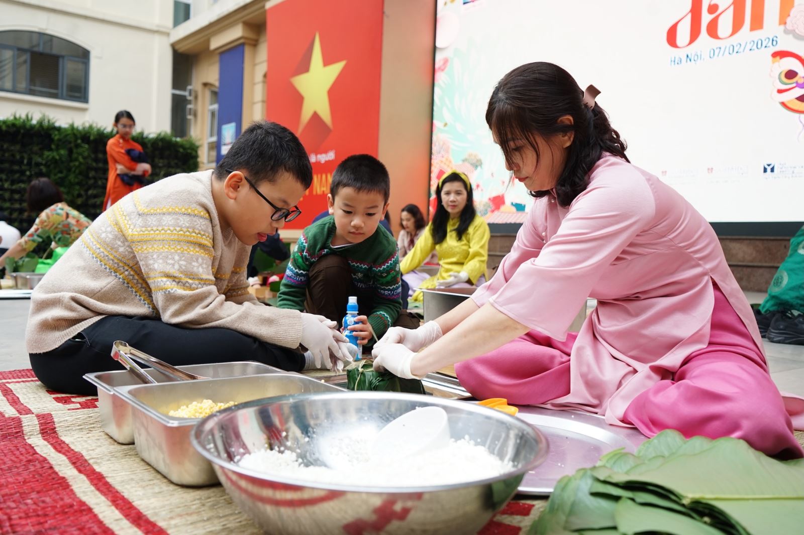 Không chỉ vậy, sức hút của Ngày hội còn đến từ các gian hàng Tết “Xuân ba miền” với những phong vị quê hương hay hoạt động gói bánh chưng xanh, khi các con cùng cha mẹ và thầy cô sẽ gác lại những bận rộn thường nhật để cùng nhau ngồi lại bên mâm lá dong xanh, tỉ mẩn đong từng bát gạo nếp thơm, đặt từng miếng nhân đậu bùi và khéo léo buộc những sợi lạt mềm.