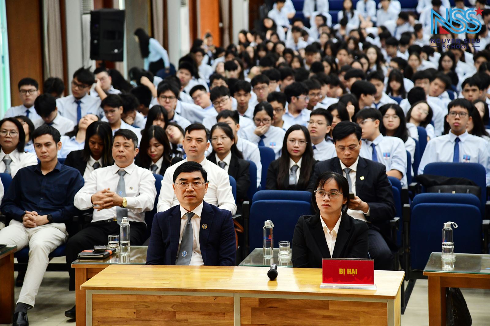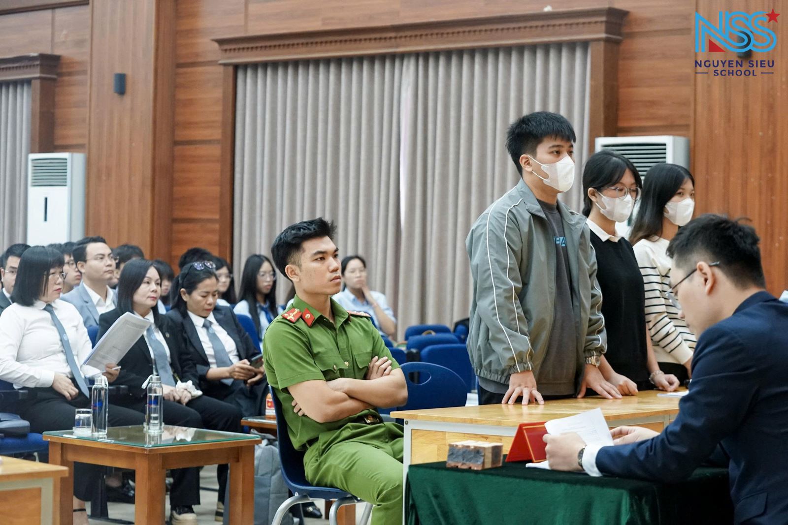 Trong không gian nghiêm túc khi Hội trường T6 trở thành “phòng xử án”, học sinh Nguyễn Siêu được theo dõi toàn bộ quy trình xét xử một vụ việc giả định liên quan đến bạo lực học đường: từ phần thủ tục, công bố cáo trạng, tranh luận giữa bên buộc tội và bên bào chữa, đến phần tuyên án.