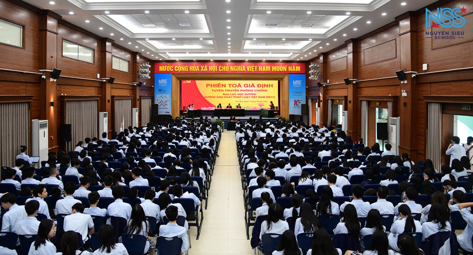 Hưởng ứng Ngày Pháp luật Việt Nam 9/11, sáng 27/10/2025, Trường Nguyễn Siêu phối hợp cùng Đoàn luật sư Thành Phố Hà Nội tổ chức Phiên tòa giả định “Tuyên truyền phòng chống bạo lực học đường”, tuyên truyền phổ biến pháp luật về tội "Cố ý gây thương tích" và "Làm nhục người khác".