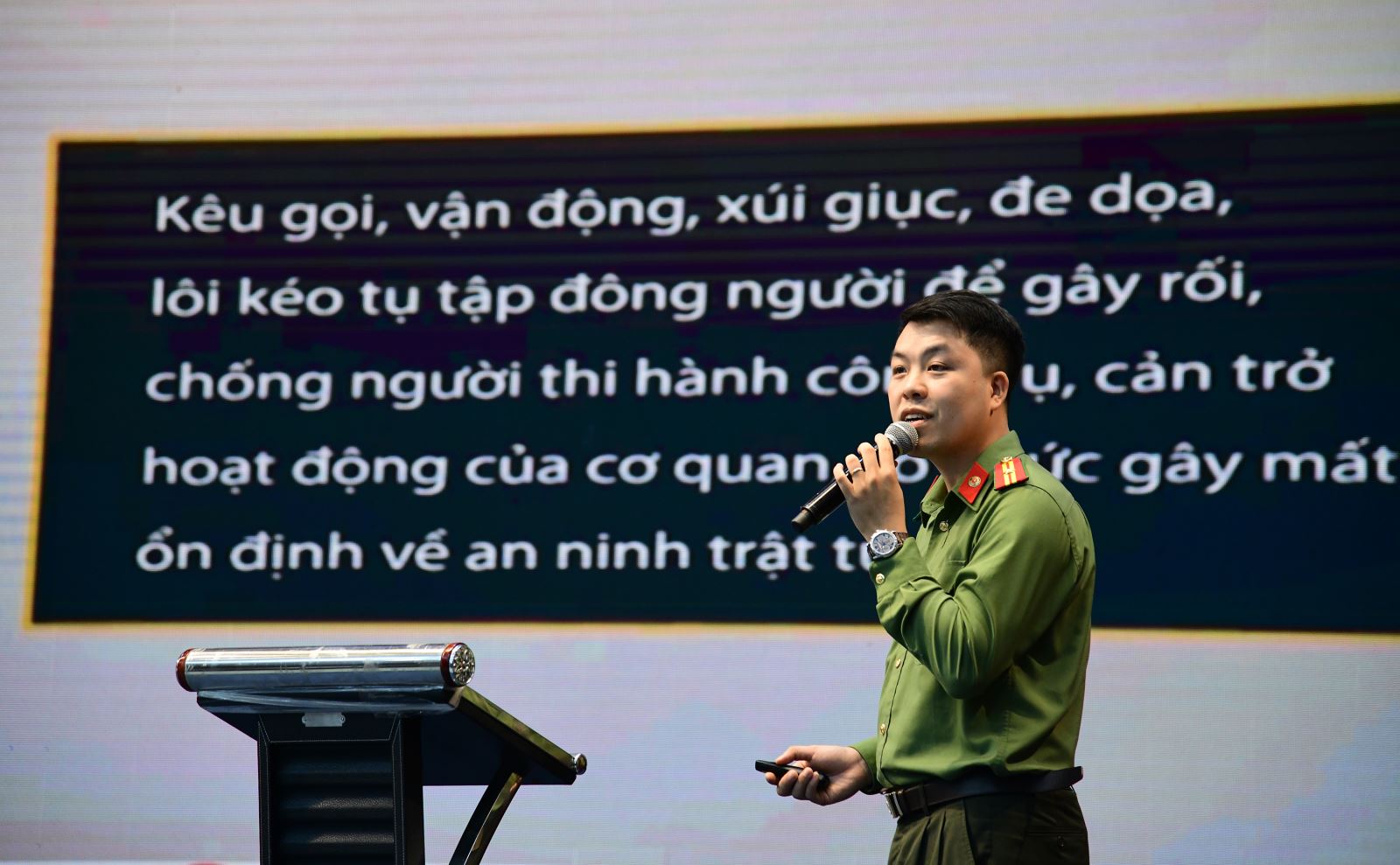 Trong phần chia sẻ đầu tiên “Tuyên truyền, phổ biến kiến thức pháp luật về an ninh mạng và phòng, chống tội phạm mạng sử dụng công nghệ cao”, Thiếu tá Nguyễn Hồng Tiến - đã giới thiệu cho các con học sinh một số nội dung cơ bản của Luật an ninh mạng, các hành vi bị nghiêm cấm, tác hại của internet và cảnh báo về thực trạng cùng những cách thức lừa đảo phổ biến hiện nay. Thiếu tá Nguyễn Hồng Tiến cho biết, chỉ trong 10 tháng đầu năm 2025, đã có tới 22.200 lượt phản ánh liên quan đến tội phạm sử dụng công nghệ cao. Đáng chú ý, nhóm đối tượng bị nhắm đến chủ yếu là học sinh, sinh viên trong độ tuổi 18 – 22, trong đó có đến 90% nạn nhân của các vụ “bắt cóc online” là nữ giới. Những hành vi phạm tội này thường bắt đầu từ việc cô lập nạn nhân, khiến các em tách khỏi những người đáng tin cậy. Từ đó, Thiếu tá Nguyễn Hồng Tiến đã đưa ra những cảnh báo và khuyến nghị để các con học sinh nâng cao cảnh giác, nhận diện sớm nguy cơ và chủ động bảo vệ bản thân trên không gian mạng.