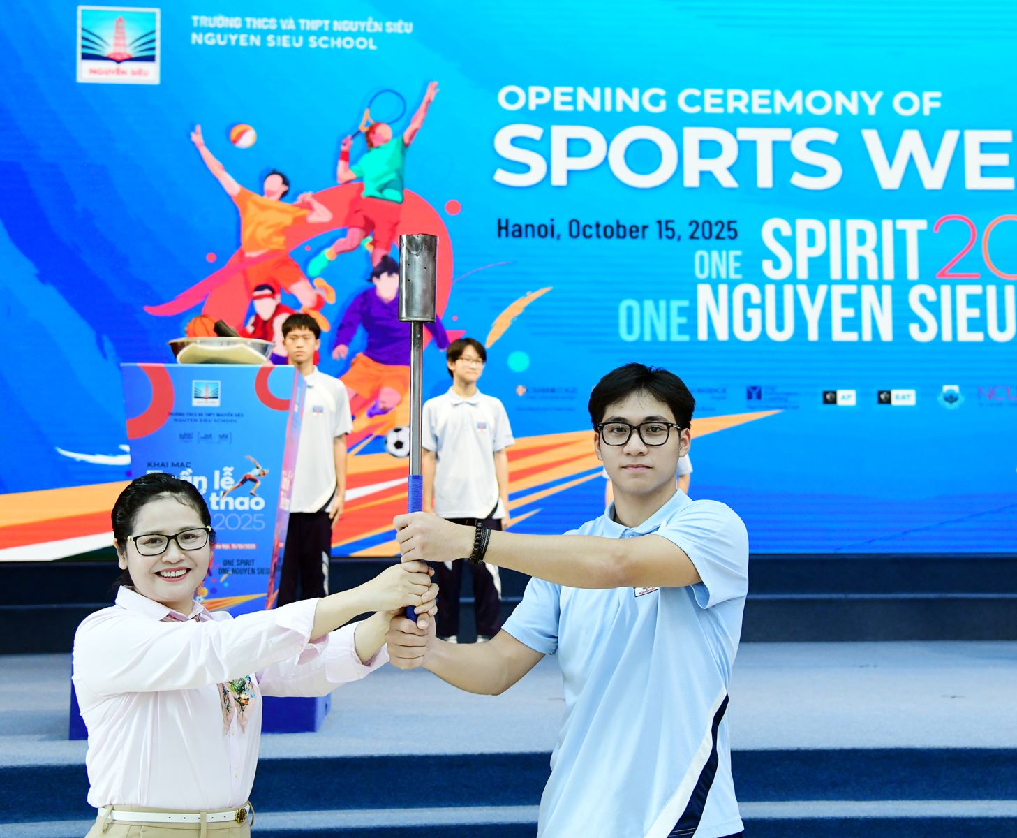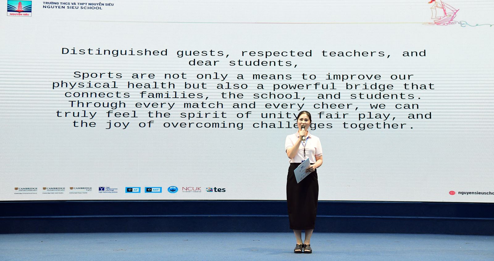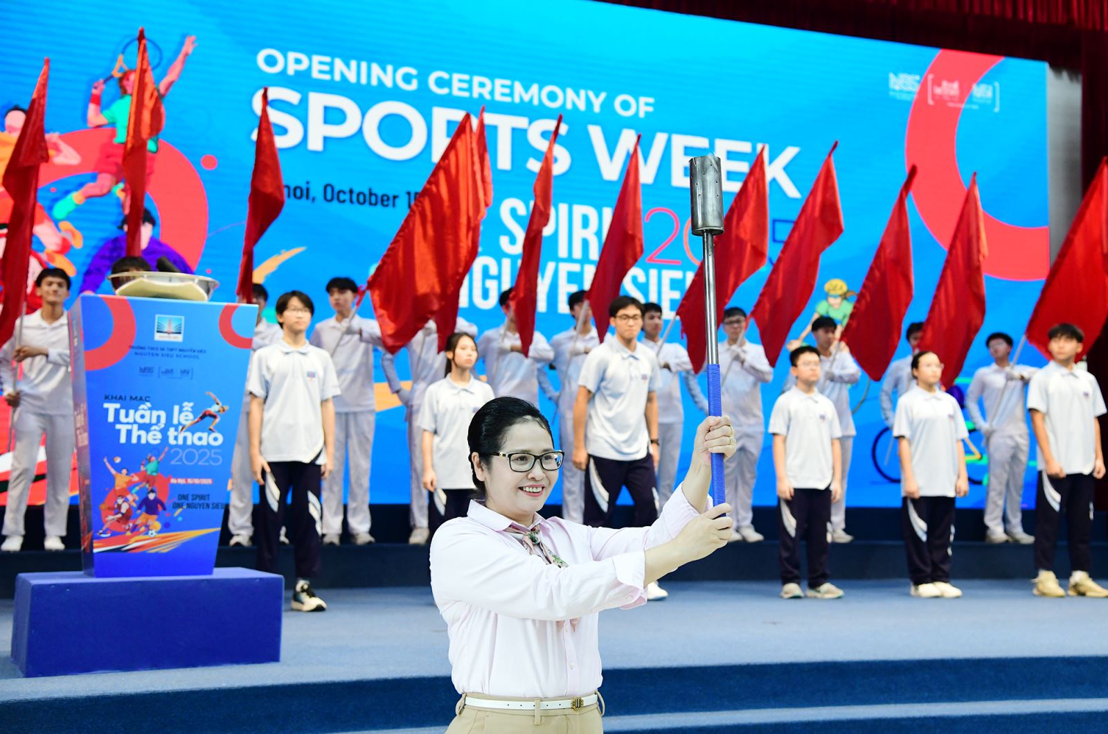 Cô Hiệu trưởng Nguyễn Thị Minh Thuý kêu gọi tất cả các vận động viên hãy tự hào khoác lên mình màu cờ sắc áo Nguyễn Siêu, cống hiến những màn tranh tài đẹp mắt, trung thực và cùng nhau tạo nên một Tuần Thể thao thành công rực rỡ!