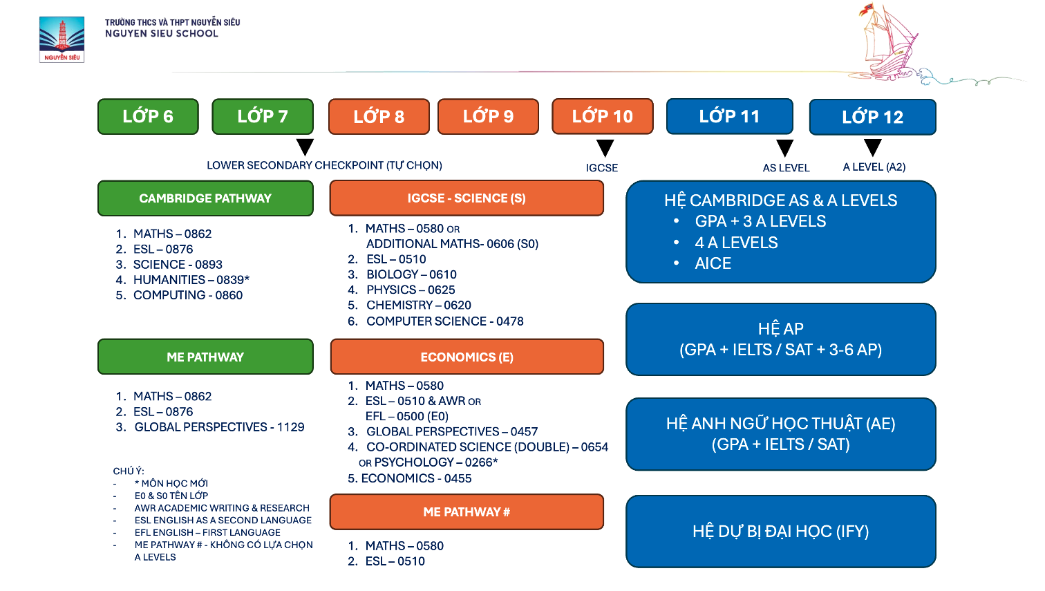 Hiện nay, chương trình Cambridge Nguyễn Siêu đang cung cấp 12+ môn học theo hai lộ trình: Khoa học cơ bản và Kinh tế Xã hội.