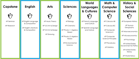 Hiện nay, chương trình AP có khoảng 38 khóa học khác nhau chia thành 7 lĩnh vực khác nhau bao gồm: Nghệ thuật (Arts), Tiếng Anh (English), Lịch sử và Khoa học xã hội (History and Social Science), Toán học và Khoa học máy tính (Math and Computer Science), Khoa học Tự nhiên (Sciences), Ngôn ngữ & văn hóa(World Languages and Culture), và Đề án nghiên cứu (AP Capstone).