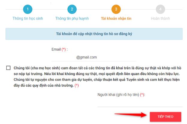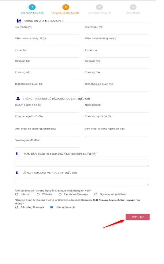 - Sau khi điền đầy đủ thông tin yêu cầu cha mẹ học sinh Click vào nút TIẾP THEO.