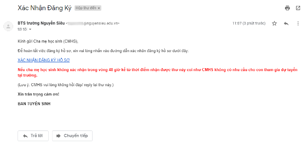 - CMHS truy cập email đăng ký và mở thư có tiêu đề Xác Nhận Đăng Ký do hệ thống tuyển sinh của trường gửi đến
