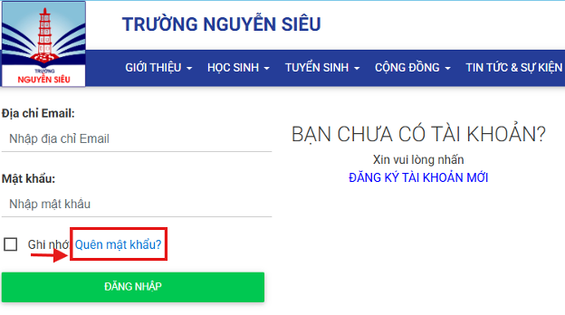 - Trường hợp CMHS đã có tài khoản nhưng quên mật khẩu, xin mời Click vào “Quên mật khẩu” và làm theo hướng dẫn để lấy lại mật khẩu.