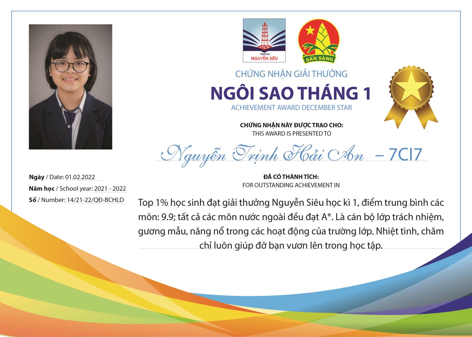 Kết thúc học kì I của năm học 2021 – 2022 - một học kỳ đầy biến động bởi đại dịch Covid-19. Nhưng dịch bệnh không ngăn cản được những cố gắng, nỗ lực rèn luyện của các bạn đội viên trường Nguyễn Siêu. Nổi bật trong đó là 4 gương mặt Ngôi sao tháng 01/2022 với những thành tích đáng nể trong học tập và công tác Đội.