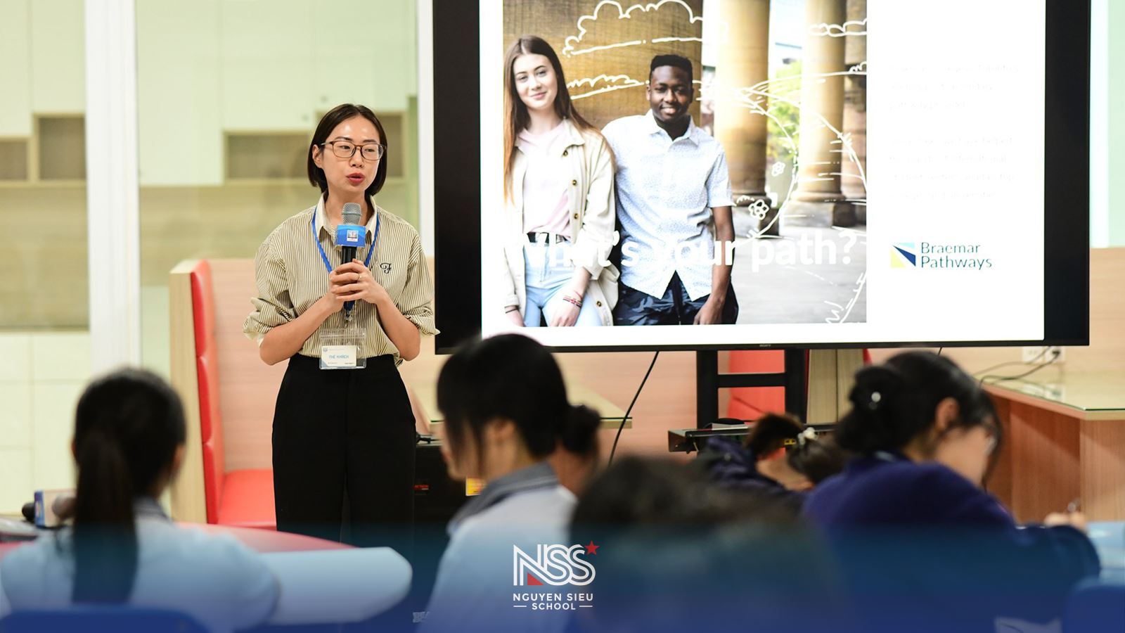 Đến với buổi hội thảo, cô Lê Hoàng Diệu Linh - Quản lý tuyển sinh và hợp tác khu vực Đông Nam Á trường Braemar College, giới thiệu tới học sinh Nguyễn Siêu lộ trình học tập giúp hồ sơ du học nâng cao khả năng cạnh tranh khi ứng tuyển trường Đại học Toronto. Điểm ưu việt của chương trình học đây là từng học sinh được cá nhân hóa lộ trình, chỉ tập trung vào những môn liên quan tới khối ngành đại học. Các môn được thiết kế theo dạng tín chỉ cuốn chiếu, giúp các em rút ngắn thời gian học và sớm nhận được bằng tốt nghiệp THPT tại Canada.