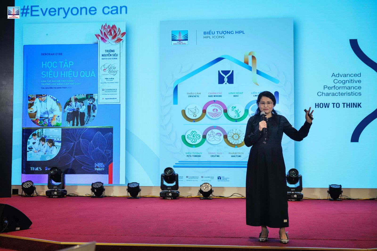 Khép lại phần tham luận, cô Thúy nhấn mạnh: “Một ngôi trường thực sự có sự phát triển bên vững đều cần giữ gốc triết lý, xây dựng văn hóa nhà trường của riêng mình. Với Nguyễn Siêu, dù là HPL hay giáo dục AI, dù hôm qua, hôm nay hay ngày mai, tất cả đều phải quay về tâm của quỹ đạo: Triết lý Vuông – Tròn. Làm việc phải "Vuông" - quyết liệt, chuẩn mực; làm người phải "Tròn" - nhân văn, thấu cảm, nhưng bên cạnh đó cũng đầy màu sắc hội nhập quốc tế của giáo sư Deborah Eyre và Rosemary Luckin. Tất cả tạo nên chân dung học sinh tương lai, thẩm thấu vào từng hành vi của các con học sinh, lan tỏa rộng rãi đến cộng đồng người Nguyễn Siêu.”