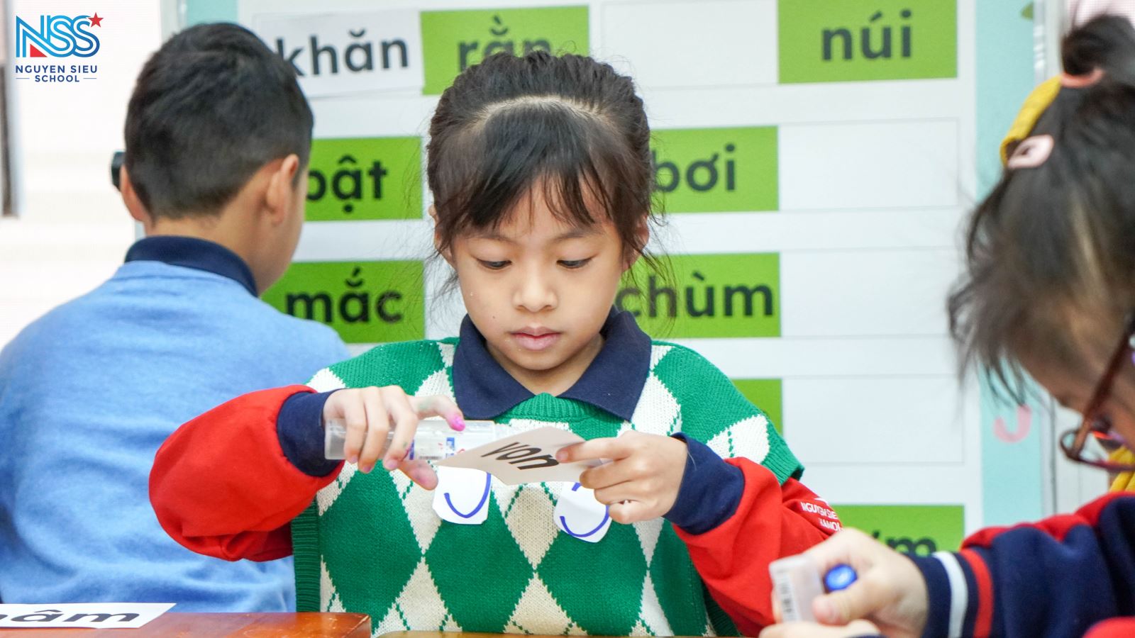Hoạt động trải nghiệm "Học tiếng Việt thật vui" được tổ chức bởi các cô giáo chủ nhiệm và giáo viên môn Tiếng Việt đã diễn ra vô cùng sôi nổi và hào hứng. Tại đây, học sinh đến từ các lớp được chia thành 05 nhóm để tham gia 05 trò chơi khác nhau, đảm bảo tất cả các con đều được tham gia vào những thử thách ngôn ngữ đầy vui nhộn và bổ ích.