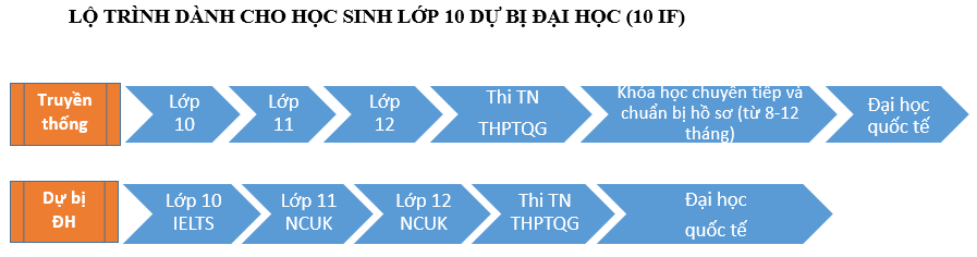 Từ đầu vào chung là học sinh hệ AE, học sinh sẽ có cơ hội tiếp tục được phân hóa theo nguyện vọng và trình độ vào lớp Dự bị Đại học (IF) để theo học chương trình phổ thông của Bộ GD&ĐT Việt Nam, song song với chương trình Dự bị Đại học NCUK (Anh Quốc) với mục tiêu giáo dục tập trung nâng cao kiến thức chuyên ngành, trình độ Tiếng Anh, xây dựng cho học sinh nền tảng kỹ năng học thuật và nghiên cứu cần thiết để học tập thành công tại các trường Đại học hàng đầu thế giới, đồng thời đảm bảo điều kiện tốt nghiệp THPT quốc gia Việt Nam.