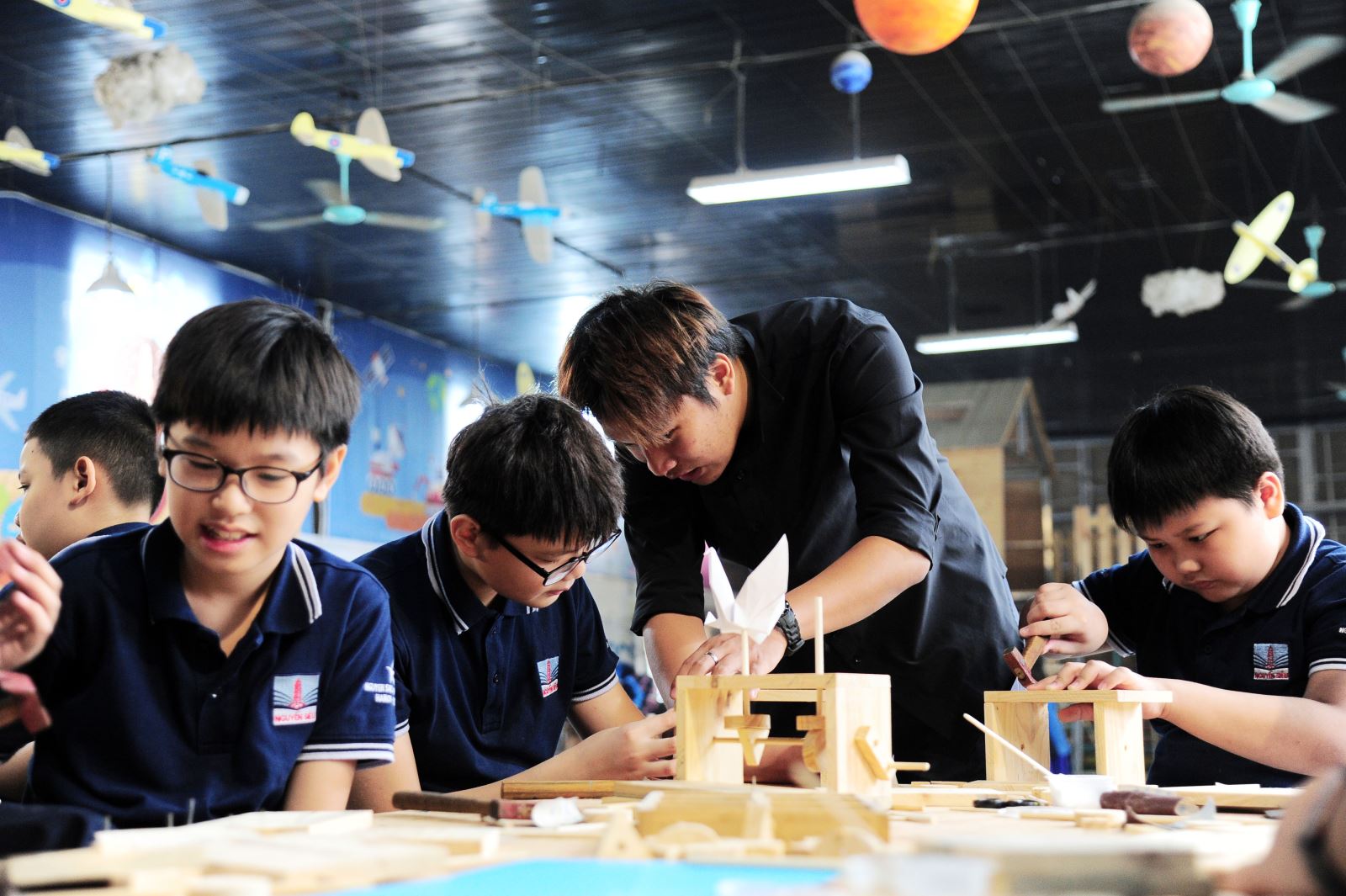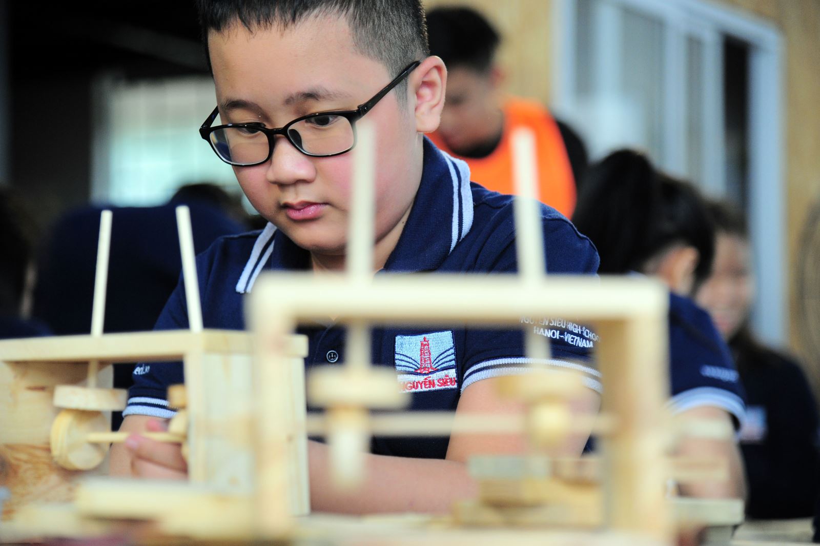 Với những mảnh gỗ thông, các bạn học sinh khối 6 đã cắt gọt tỉ mỉ thành các bánh xe hình tròn, hình tam giác để gắn vào trục quay, từ đó đóng thành chiếc hộp có những chú chim, cá heo nhảy múa bên trên. Sản phẩm đơn sơ vậy thôi nhưng nó đòi hỏi các bạn phải thật sự tập trung, khéo léo và chính xác, bởi làm việc với những chiếc đinh, chiếc búa không hề dễ dàng.