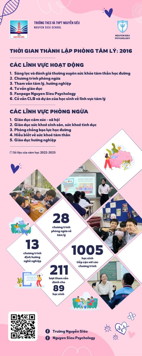 Chuỗi chương trình phòng ngừa về sức khỏe tâm thần đã và đang được triển khai tới các học sinh từ khối 6 – 12 nhằm giúp học sinh có góc nhìn khoa học về vấn đề sức khỏe tâm thần của bản thân, từ đó có các chiến lược chăm sóc bản thân hiệu quả. Song song với hoạt động giảng dạy, Bộ phận Tâm lý của nhà trường cũng duy trì hoạt động truyền thông, phát động các thử thách nhỏ để nâng cao nhận thức về sức khỏe tâm thần thông qua trang fanpage Nguyen Sieu Psychology.