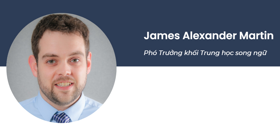 Thầy James Alexander Martin - Phó trưởng khối Trung học (Song ngữ): tốt nghiệp Đại học chuyên ngành Sinh học phân tử tại Đại học Manchester, hoàn thành chứng chỉ giảng dạy PDCE do Đại học Derby cấp và chính thức trở thành giáo viên đạt chuẩn Anh quốc. Thầy James có kinh nghiệm giảng dạy và quản lý với vị trí Tổ trưởng tổ Khoa học và đây là năm học thứ 5 thầy công tác tại trường.
