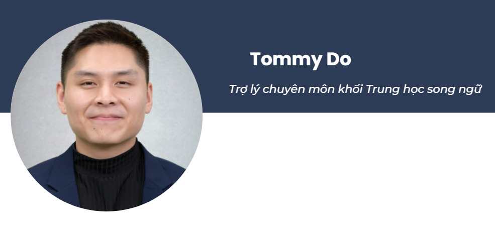 Thầy Tommy Do – Trợ lý chuyên môn khối Trung học (Song ngữ): tốt nghiệp đại học Texas, Arlington chuyên ngành ngôn ngữ học và tâm lý học với chứng chỉ TESOL, lấy bằng thạc sĩ giảng dạy và trở thành giáo viên đạt chuẩn của bang Texas. Thầy hiện đang hoàn thành chương trình Tiến sỹ ngành Khoa học dữ liệu và máy tính tại trường Đại học Mississippi State University. Thầy có hơn 5 năm kinh nghiệm giảng dạy tại các trường quốc tế ở Mỹ, Qatar, Mông Cổ và Ý. Bên cạnh đó, thầy có hơn 2 năm kinh nghiệm điều phối chương trình giảng dạy tại trường học thuộc bang Texas, Mỹ.