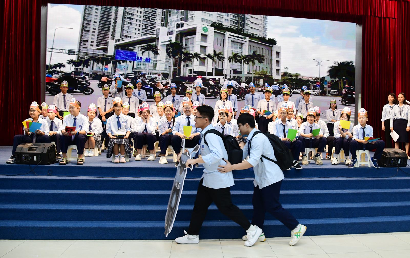 Các học sinh tham gia là đại diện các lớp từ khối 6 – khối 12, trả lời 10 câu hỏi xoay quanh những kiến thức về an toàn giao thông đường bộ, thời gian chuẩn bị trả lời là 10 giây cho mỗi câu hỏi. Thí sinh trả lời bằng hình thức chọn, giơ đáp án bạn cho là đúng (A – B – C – D). Sau 10 giây, thí sinh nào chưa có đáp án hoặc thay đổi đáp án, hoặc đáp án sai thì sẽ tự động rời khỏi sàn thi đấu.