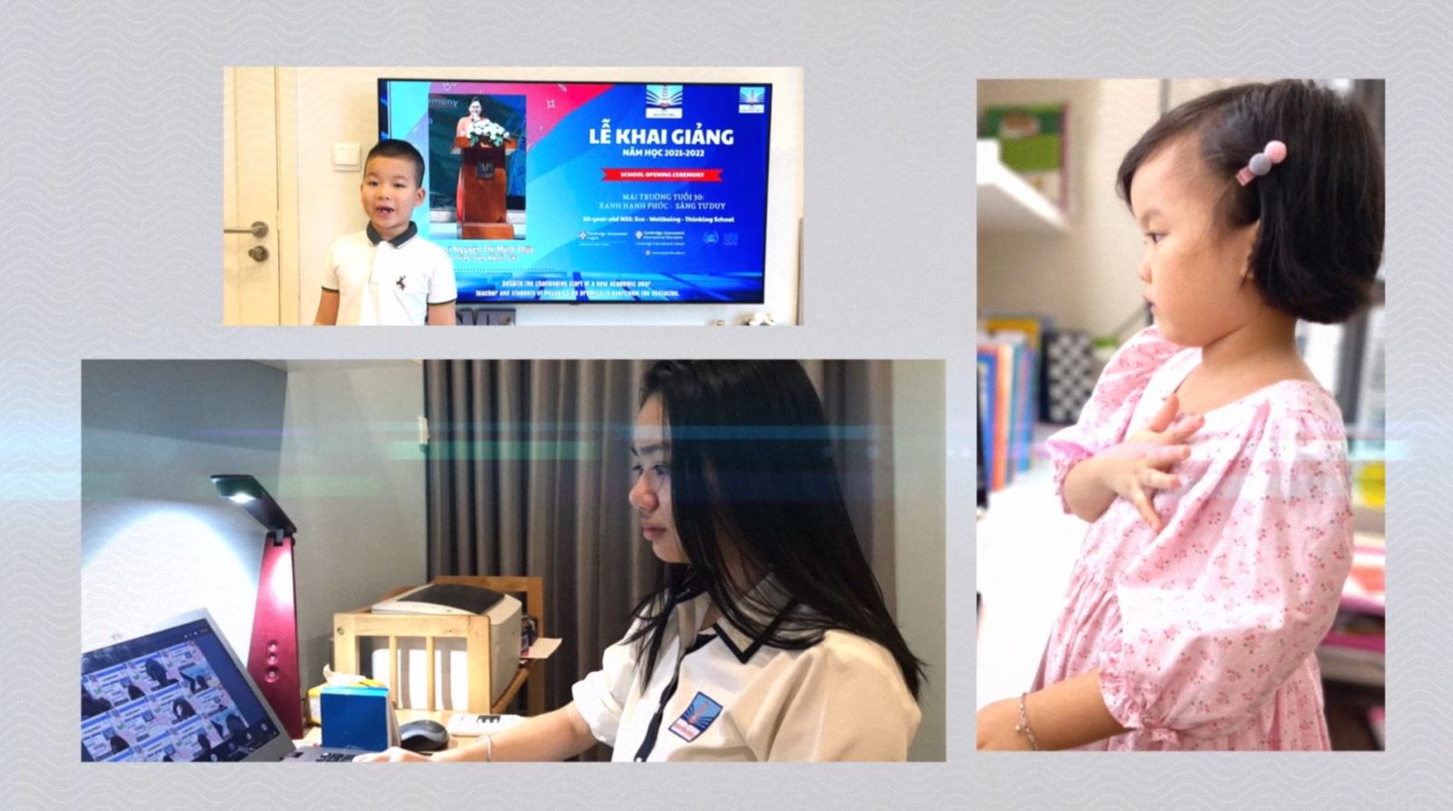 Hình ảnh đầy xúc động của hai anh em đón Khai giảng lệch múi giờ từ đất nước Nam Phi xa xôi, chờ chuyến bay giải cứu. Một cậu học trò đón Khai giảng trong màn vì “Con ở quê tránh dịch, muỗi quá nên mắc màn đón khai giảng”. Thương nhất có lẽ là những học sinh đầu cấp, nhất là các em út lớp 1, lần đầu tiên đón khai giảng mà không được tới trường, không được diễu hành trong sự chào mừng của thầy cô và anh chị. Nhưng các con vẫn tự tạo ra dấu ấn riêng của mình, bằng cờ hoa tự làm, bằng logo trường tự vẽ, mỗi nụ cười của học sinh khối 1, đã lan tỏa năng lượng tích cực đón chào năm học 2021-2022.
