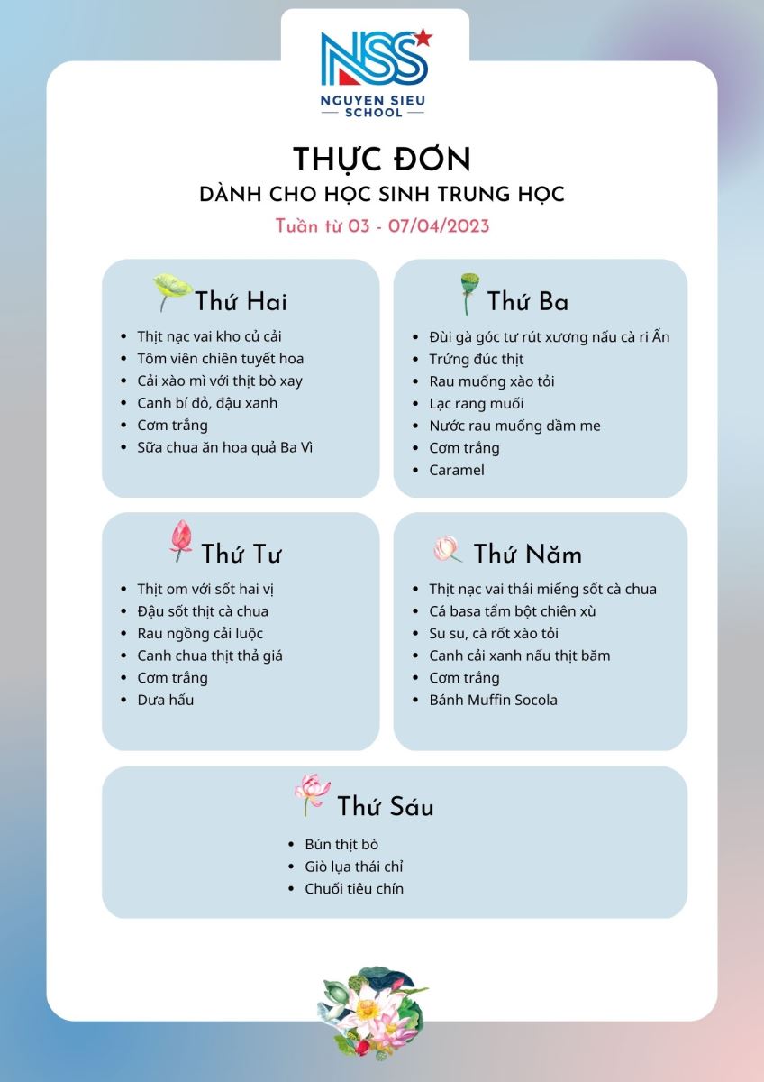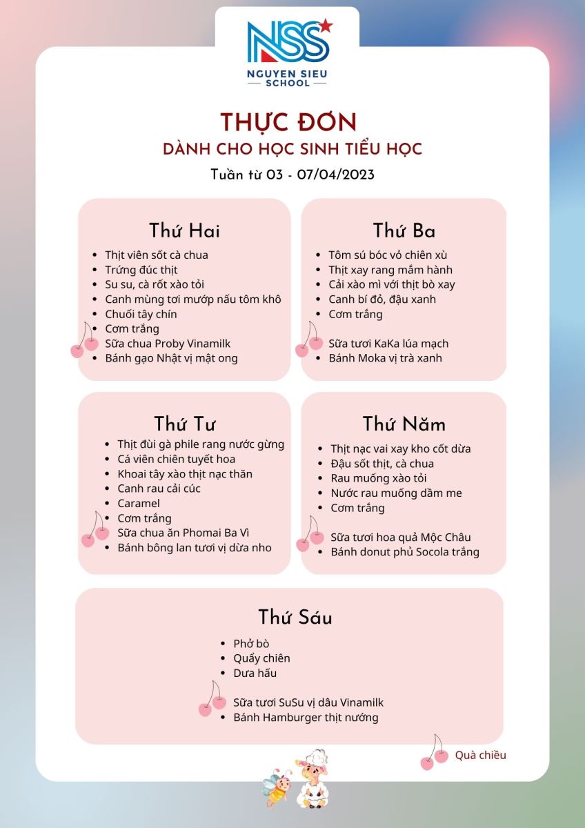 Thực đơn Tuần 03-07/4/2023