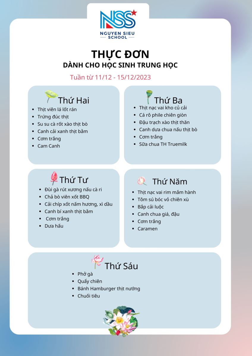 THỰC ĐƠN TUẦN 11/8 - 15/8/2025