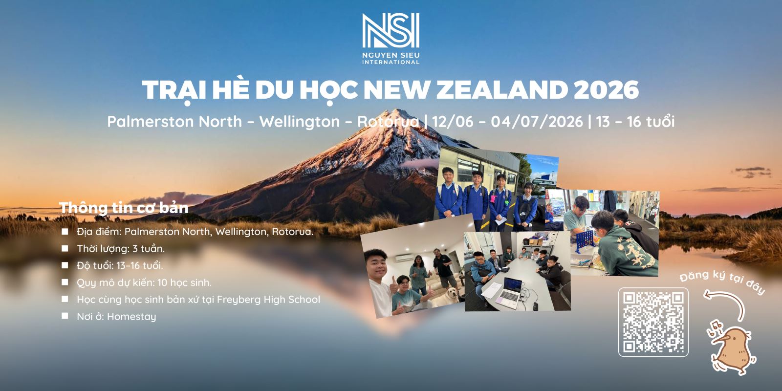 Chương trình trại hè New Zealand 2026 diễn ra từ 12/06/2026 đến 04/07/2026, với các điểm đến chính gồm Palmerston North, Wellington và Rotorua. Học sinh được học cùng học sinh bản xứ, ở homestay và đặc biệt có buddy bản xứ hỗ trợ làm quen với trường học, môi trường sống và các hoạt động hằng ngày.
