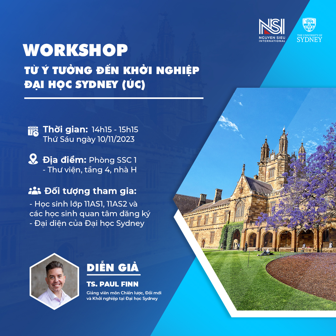 - Tại workshop, TS. Paul Finn - Giảng viên môn Chiến lược, Đổi mới và Khởi nghiệp tại Đại học Sydney sẽ cùng học sinh Nguyễn Siêu “giải mã” những yếu tố làm nên sự thành công của một Start-up, tập trung xoay quay trả lời các câu hỏi: